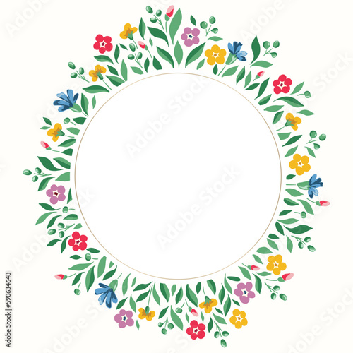 Bright Chintz Romantic Meadow Wildflowers Vector Round Frame. Cottagecore Garden Flowers and Foliage Wedding Invitation. Homestead Bouquet. Farmhouse Background