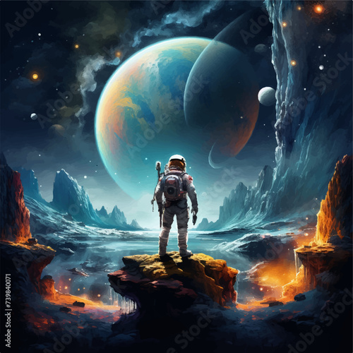 Bright colorful illustration - Cosmonaut in space. Alien life