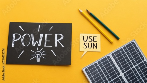 Bright Concept of Renewable Energy and Solar Power with Light Bulb Drawing on Black Cardboard Against Yellow Background