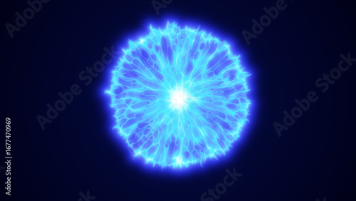 Bright electric blue sphere with fluid energy lines radiating outward on a dark background