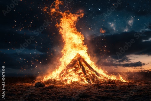 Bright flames illuminate the dark sky during a celebratory bonfire at dusk