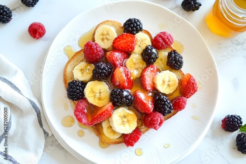 Bright fruit toast features creamy almond butter, sliced bananas, and fresh berries drizzled with honey, creating a fun and inviting meal perfect for any casual occasion