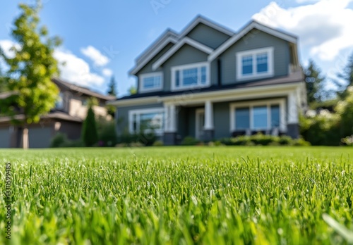 Bright Green Grass in Front of a Modern House with Clear Blue Sky and Wispy Clouds in the Background on a Sunny Day