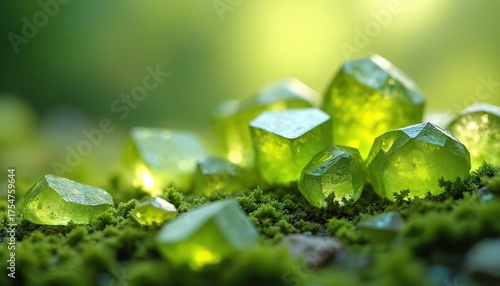 Bright green peridot gemstones sit on vibrant moss ground. Faceted crystals sparkle under natural light, showing deep vivid mineral texture. Close up of nature beauty, fresh eco feel, growth, natural