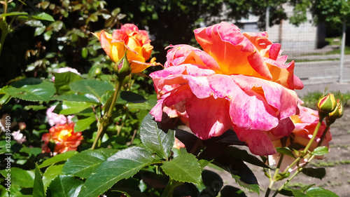 Bright hybrid tea roses with delicate pink and orange petals bloom in a sunny garden. Sunlight plays on the petals.