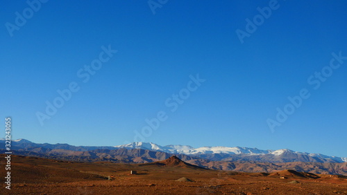 Bright landscape of Morocco, breathtaking curves of mountains, stunning combination of hills & farm land,inadvertent distribution of houses & huts, raw impression of pure nature.