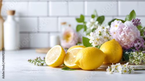 Bright lemons and vibrant flowers create a refreshing kitchen arrangement in springtime joy
