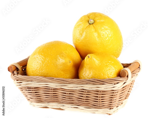 Bright lemons in a basket isolated on white background