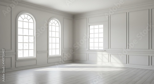 Bright light fills an empty white room, minimalist architecture and large windows