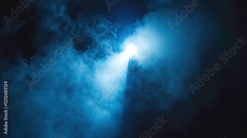 Bright light shining through blue smoke and dark clouds.