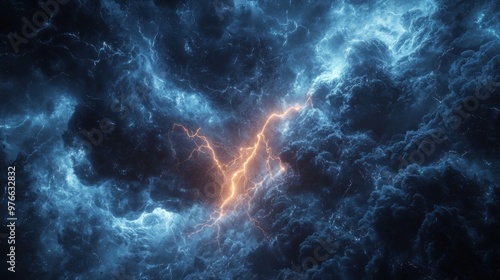 Bright lightning bolt cutting through an intense storm, the atmosphere charged with energy and drama