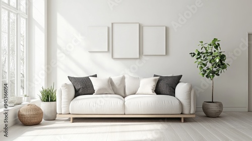 Bright living space featuring a sofa in a modern Scandinavian style 3D rendering of contemporary interior design