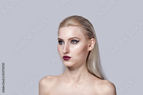 Bright make-up in a woman with bare shoulders. Stylish haircut.