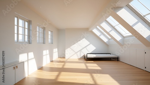 Bright minimalist attic interior with wooden floor and skylights creates serene atmosphere