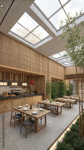 "Bright Minimalist Restaurant with Skylight, Wooden Furniture, and Greenery Touches – A Cozy, Sunlit Spot for Contemporary Dining and Relaxation"