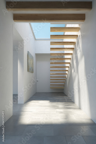 Bright modern hallway with open stairs and a skylight creates an airy atmosphere with clean lines and natural light.