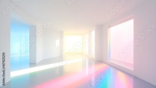 Bright modern interior with sunlight and rainbow reflections on glossy floor, creating futuristic aesthetic design and colorful atmosphere.