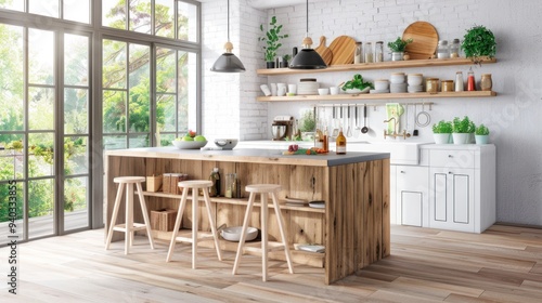 Bright modern kitchen interior with wooden elements and natural light. Contemporary home decor and design concept.