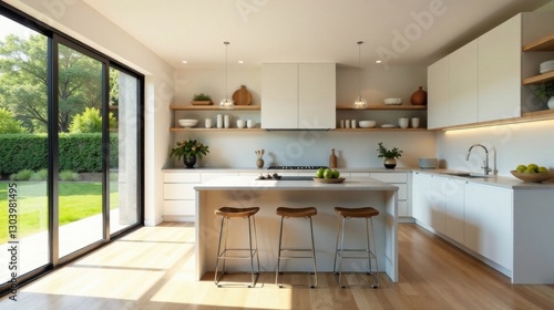 Bright, modern kitchen with island and sliding glass doors to a garden
