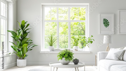 Bright modern living room with large window, white walls, cozy sofa, and various green indoor plants enhancing a fresh, minimalist design.