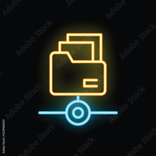 Bright neon folder icon connecting to a network, sharing files