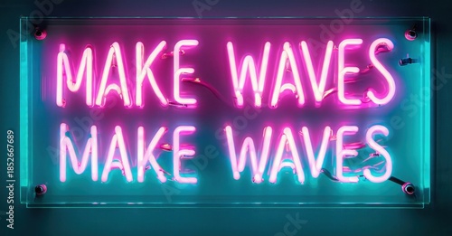 Bright neon sign displays text Make Waves twice. Pink, turquoise glow against dark background. Modern, vibrant aesthetic.
