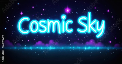 Bright neon text reads Cosmic Sky over dark background. Purple mountains, sparkling stars create vibrant scene.