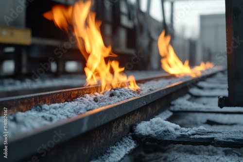 Bright orange flames dance along the metal tracks under frosty conditions, contrasting warmth and cold in a dynamic industrial setting.