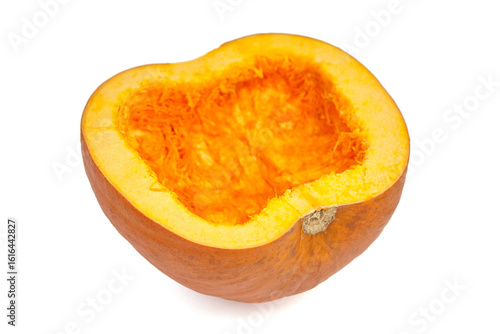 Bright orange pumpkin cut in half, showcasing its vibrant inner flesh and seeds, perfect for autumn decorations and seasonal culinary creations