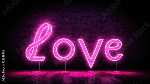 Bright pink neon "LOVE" sign glowing against a dark brick wall, reflecting on the wet floor beneath, creating a romantic and vibrant atmosphere