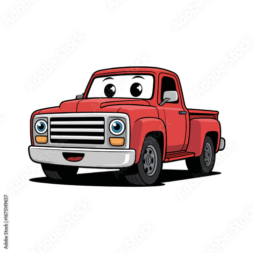 Bright red cartoon pickup truck with cheerful expression is ready for adventure and fun in a playful world