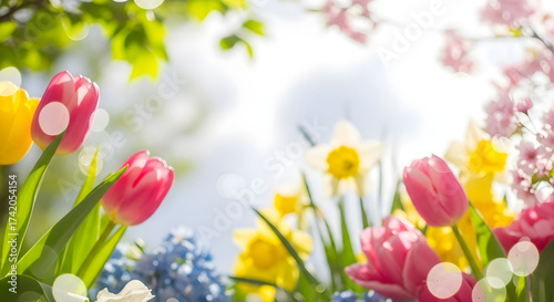 Bright spring flowers blooming in the sunlight bokeh effect