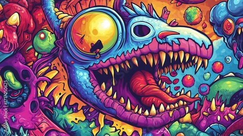 Bright, stylized illustration with monsters, a dragon, and wild colors creating a chaotic, dense composition