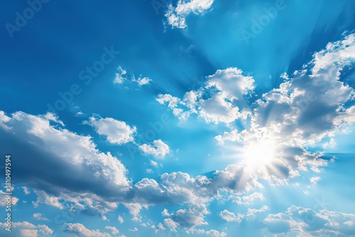 Bright Sunlight Breaking Through Wispy Clouds in a Deep Blue Sky with Radiant Beams