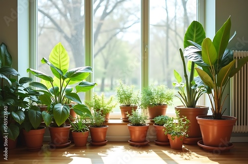 Bright sunlight houseplants in terracotta pots spring collection ai generated