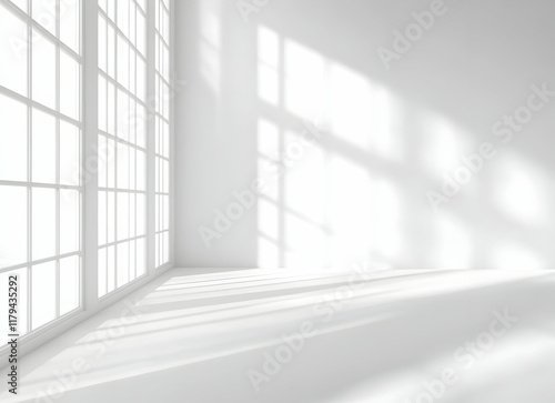 Bright Sunlit Room with Large Windows Casting Intricate Shadows on Minimalistic White Walls