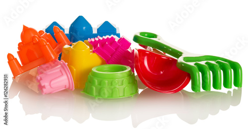 Bright toys for sandbox isolated on white.