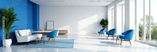 Bright white walls, blue accents, modern furniture, open layout, plants, interior