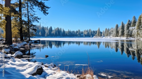 Bright winter sunlight filters through a forest, reflecting off a calm lake surrounded by snow-covered rocks and trees.