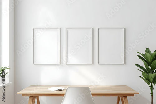 Bright workspace featuring three blank white frames above a minimalist desk setup and plant