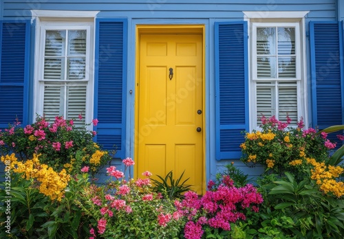 Bright Yellow Door Surrounded by Colorful Flowers on Blue House Exterior with Charming Shutters and Lush Greenery in Vibrant Garden Setting