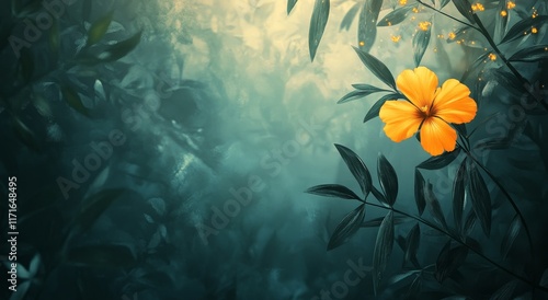 Bright yellow flower stands out against a blurred green background with soft bokeh effect
