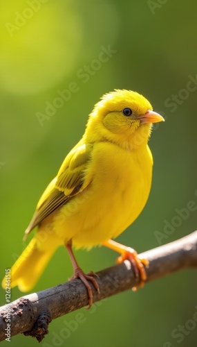 Bright yellow Sicalis Flaveola enjoys rice breakfast, spring sunlight , sunny, serene