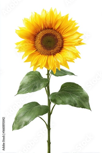 Bright yellow sunflower with green leaves on a white background