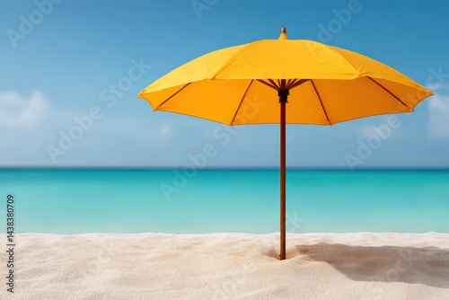 Bright yellow umbrella casting shadow on pristine white beach near turquoise ocean under blue sky as vacation travel concept in peaceful minimalist tropical resort backdrop
