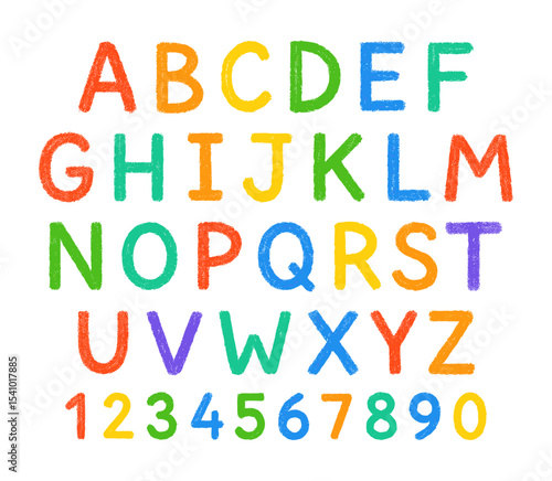 Brightly Colored Crayon Drawn Alphabet and Numbers on White
