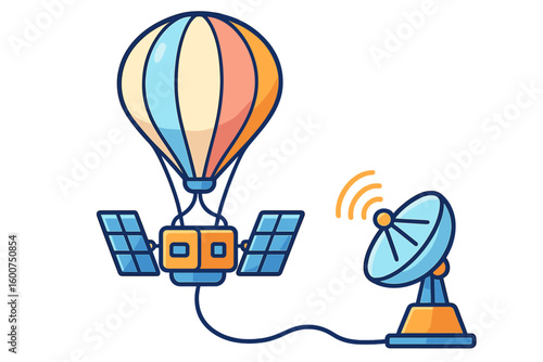 Brightly colored hot air balloon with solar panels connected to a satellite dish in a whimsical design