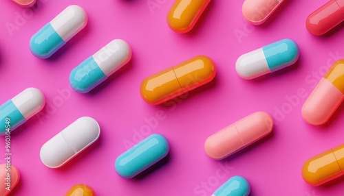 Brightly colored pills, organized in gradient pattern, 3D illustration