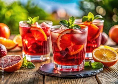 Brightly colored red beverages filled with ice, garnished with citrus, sparkle under the sun, creating a refreshing summer vibe on a cheerful day.
