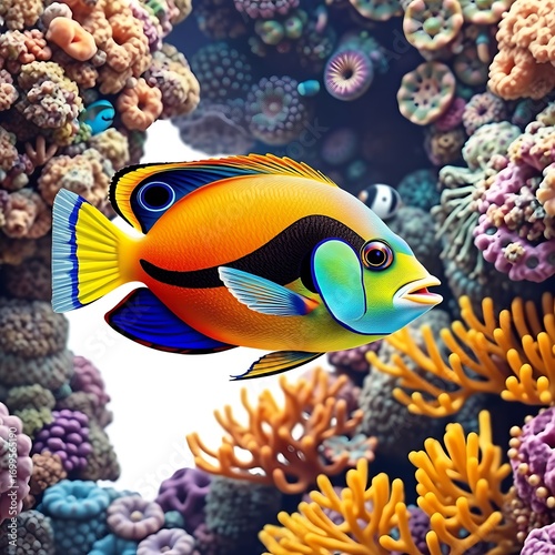 Brightly colored tropical fish swims through vibrant coral reef teeming with marine life